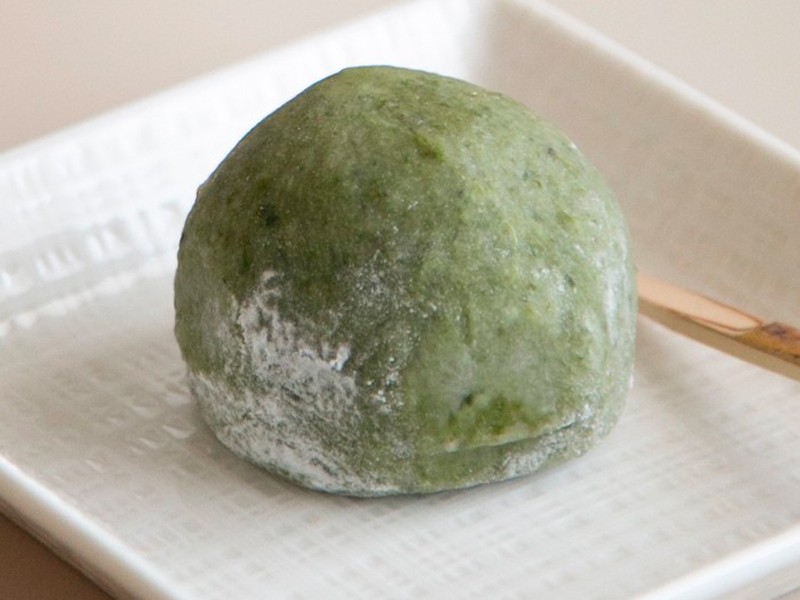 上新粉(うるち米の粉)の生地の餅です。よもぎの香りと歯切れのよい生地、小豆粒餡をでつくりました。