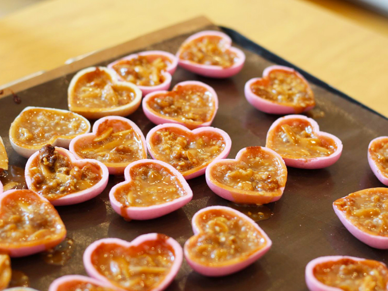 4cm位のハートの最中皮一片にアーモンドやクルミのフロランタンを詰めました。